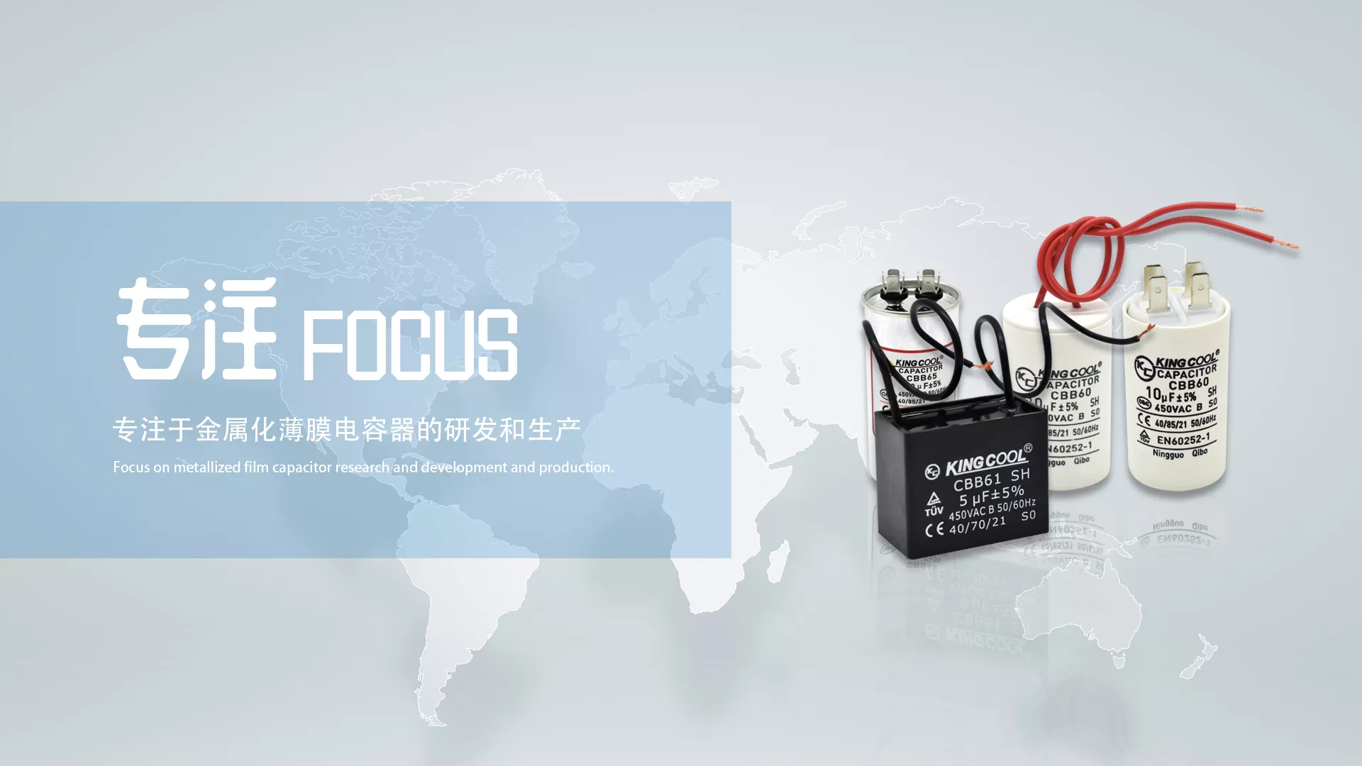 主要产品有:CBB60、61、65系列金属化薄膜交流电动机电容器;CBB66防爆型金卤灯专用电容器、CBB80型功率因数补偿电容器); CD60型电机启动用铝电解电容器;BCMJ自愈式低压并联电容器;超级电容器;其他特种电容器等。产品先后通过了CQC、UL、CE、TUV、VDE、CSA等国内外认证,并获得多项中国国家专利。